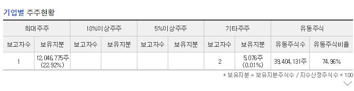 시가총액은 1,682억원 발행주식수는 52,563,769주이며 유동 비율은 74.96%입니다.