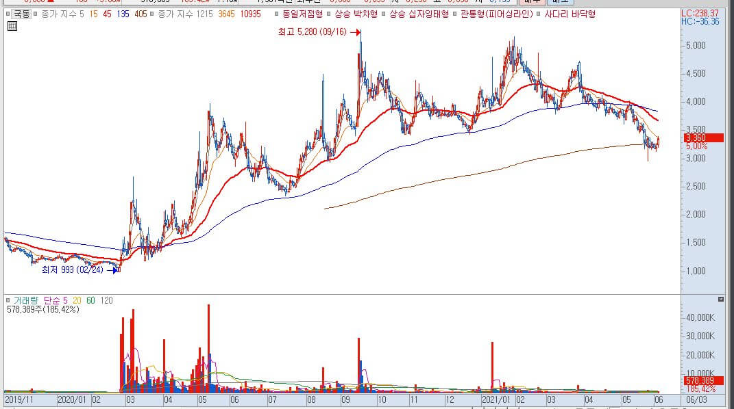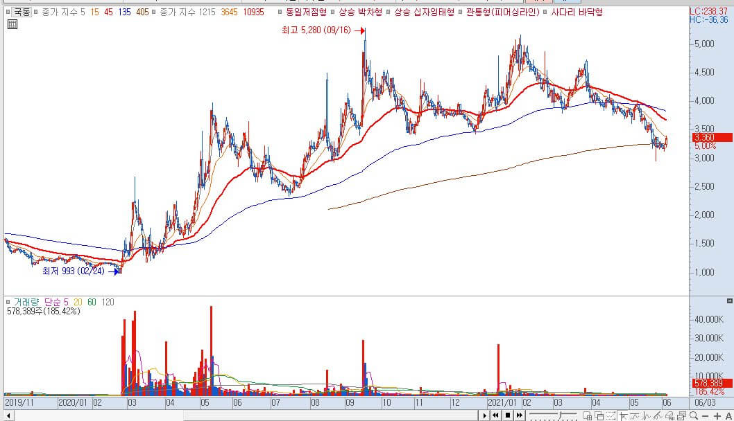 국동 주가 캔들볼륨의 흐름입니다.